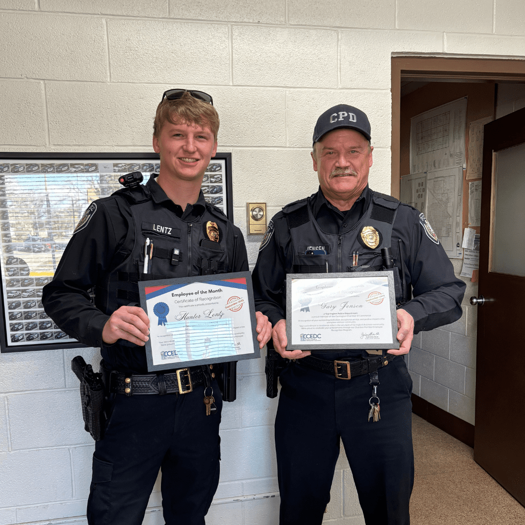 The Carrington Chamber & EDC is proud to recognize Officers Gary Jensen and Hunter Lentz of the City of Carrington Police Department as our September 2025 Employees of the Month. Nominated by Police Chief Christopher Bittmann, both officers were praised for their exceptional work ethic, professionalism, and commitment to public safety. “Officers Jensen and Lentz consistently demonstrate the highest quality in their work,” Chief Bittmann wrote. “They go above and beyond their duties, engaging with residents and building trust within the community.” Known for their calm demeanor, teamwork, and proactive approach to policing, Officers Jensen and Lentz are respected both within the department and throughout the Carrington community. Their dedication to fostering connection, mentoring newer officers, and supporting their fellow team members makes them invaluable to our city. We thank Officers Jensen and Lentz for their service, leadership, and everyday commitment to making Carrington a safer, more connected place to live.